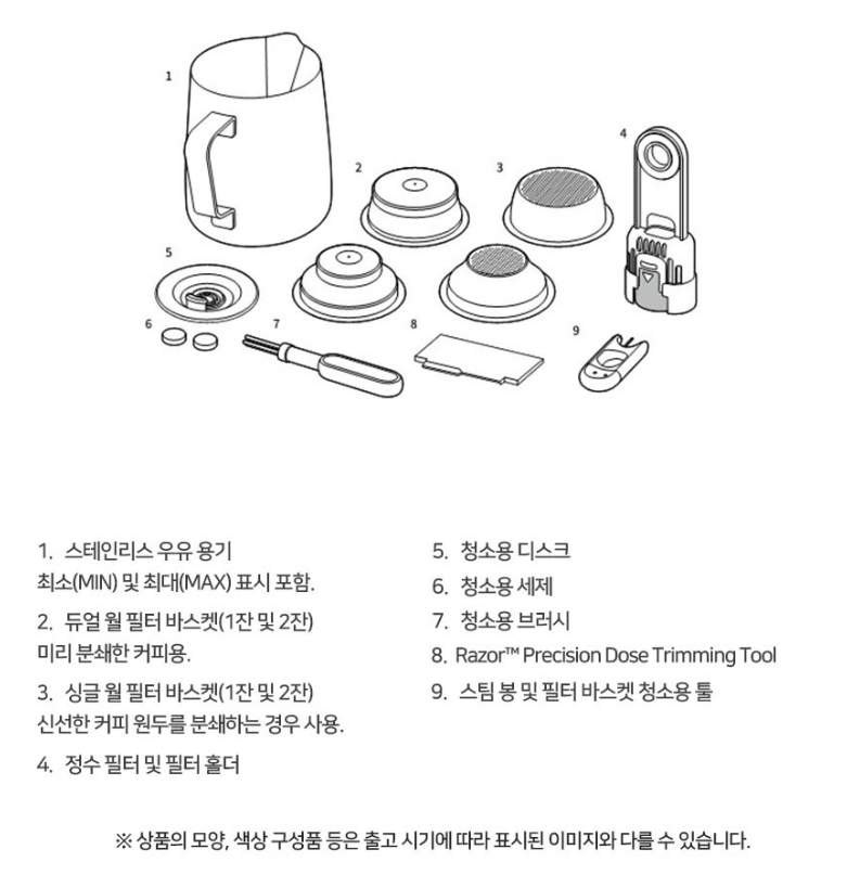 별도로 정수필터, 백플러시 디스크, 커피 저울, 탬핑 매트 등을 추가 구매하면