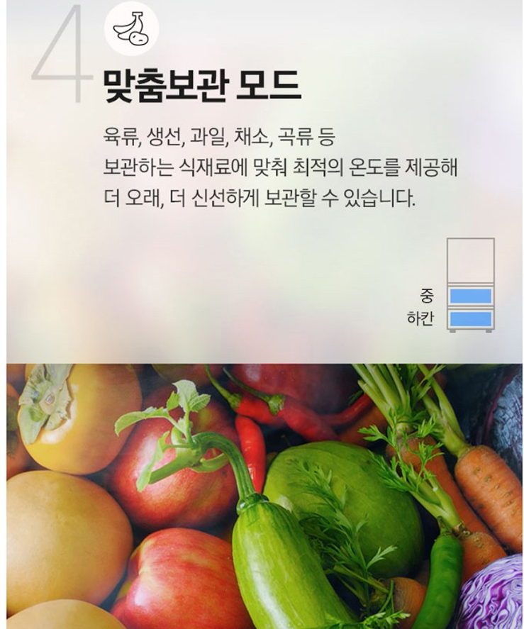 - 비김치 시즌 (봄~여름) : 과일, 음료, 육류, 반찬 등 냉장 기능으로 활용