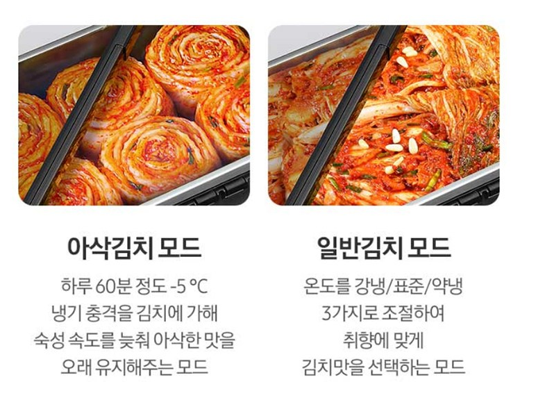 - 배추김치 모드: 깊은 맛의 중기 숙성 후 자동 보관 전환
