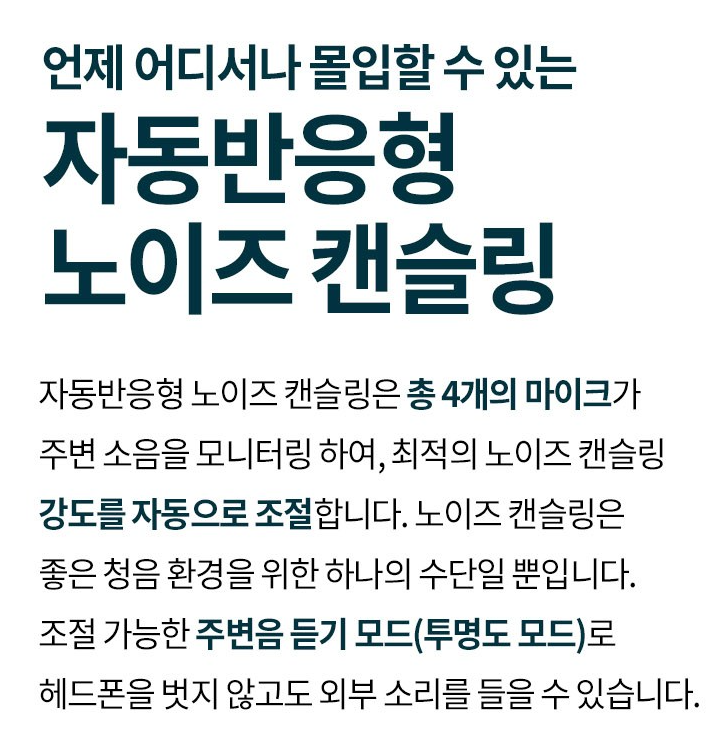 트랜스페런트 모드로 주변 소리를 자연스럽게 들을 수 있어, 이동 중 안전성도 확보했습니다.