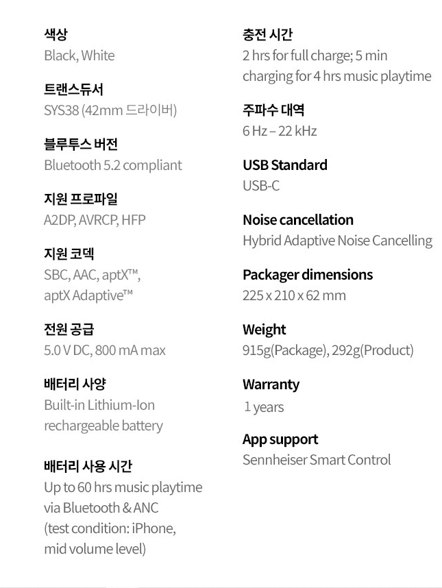젠하이저 특유의 심플하고 고급스러운 디자인으로, 화이트 컬러와 그레이 패브릭 조합이 모던하면서 세련된 분위기를 연출합니다.